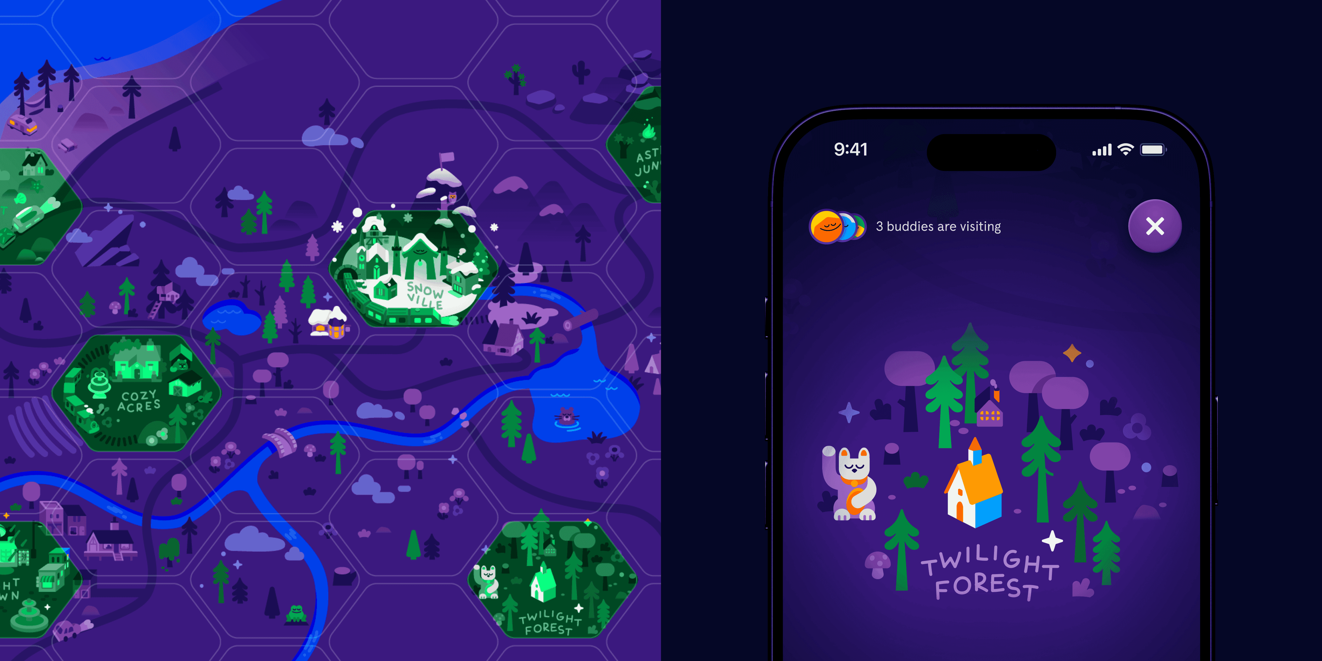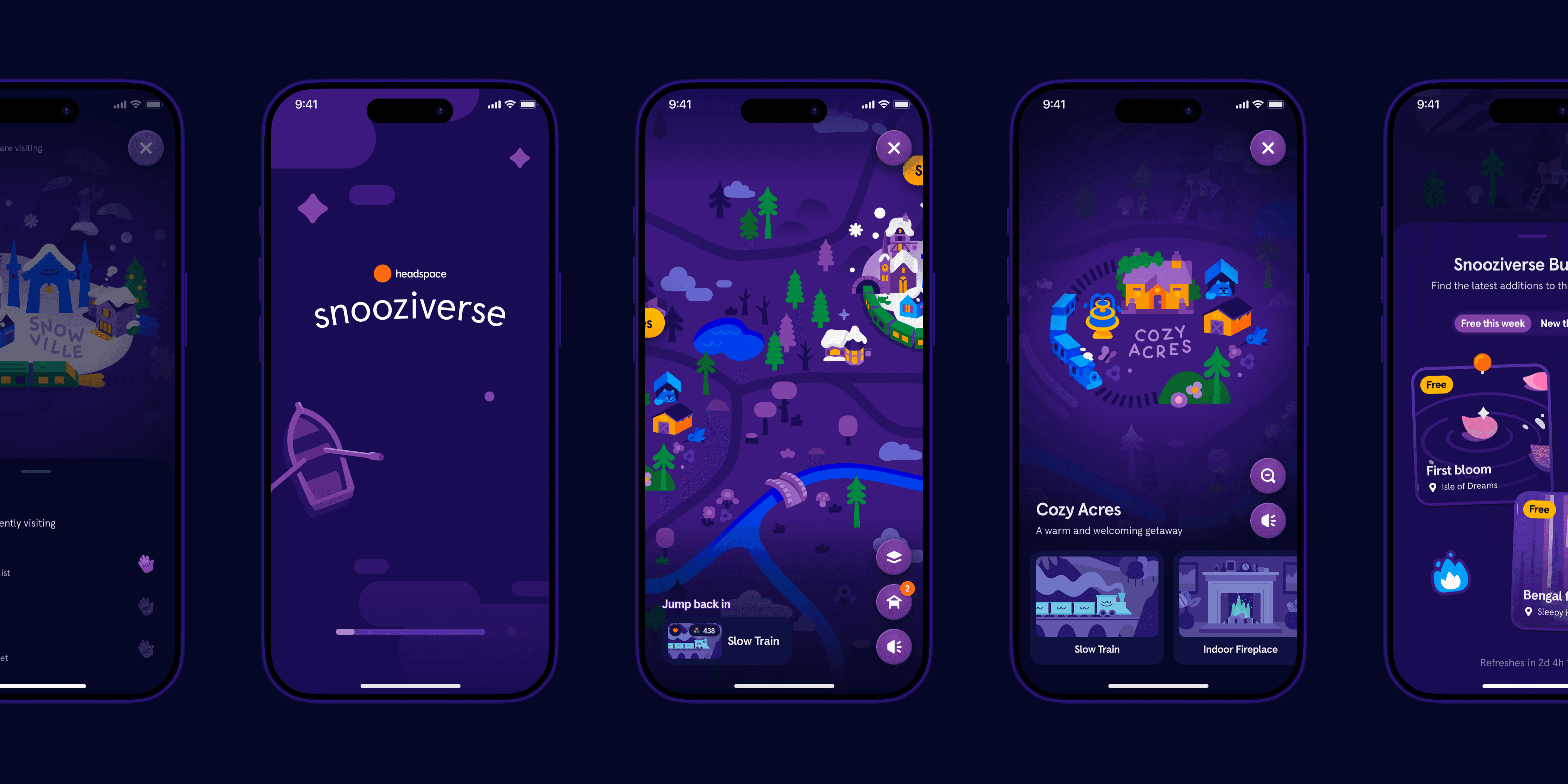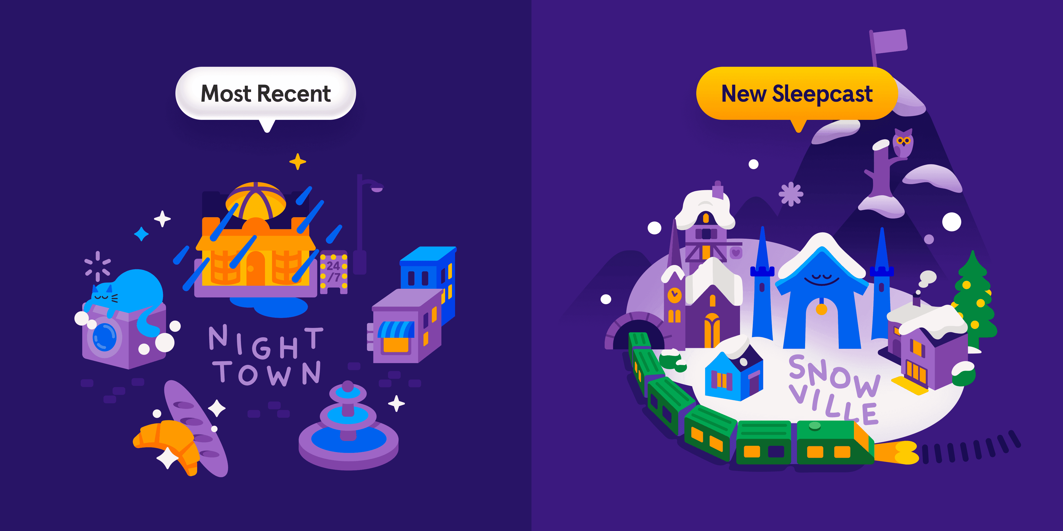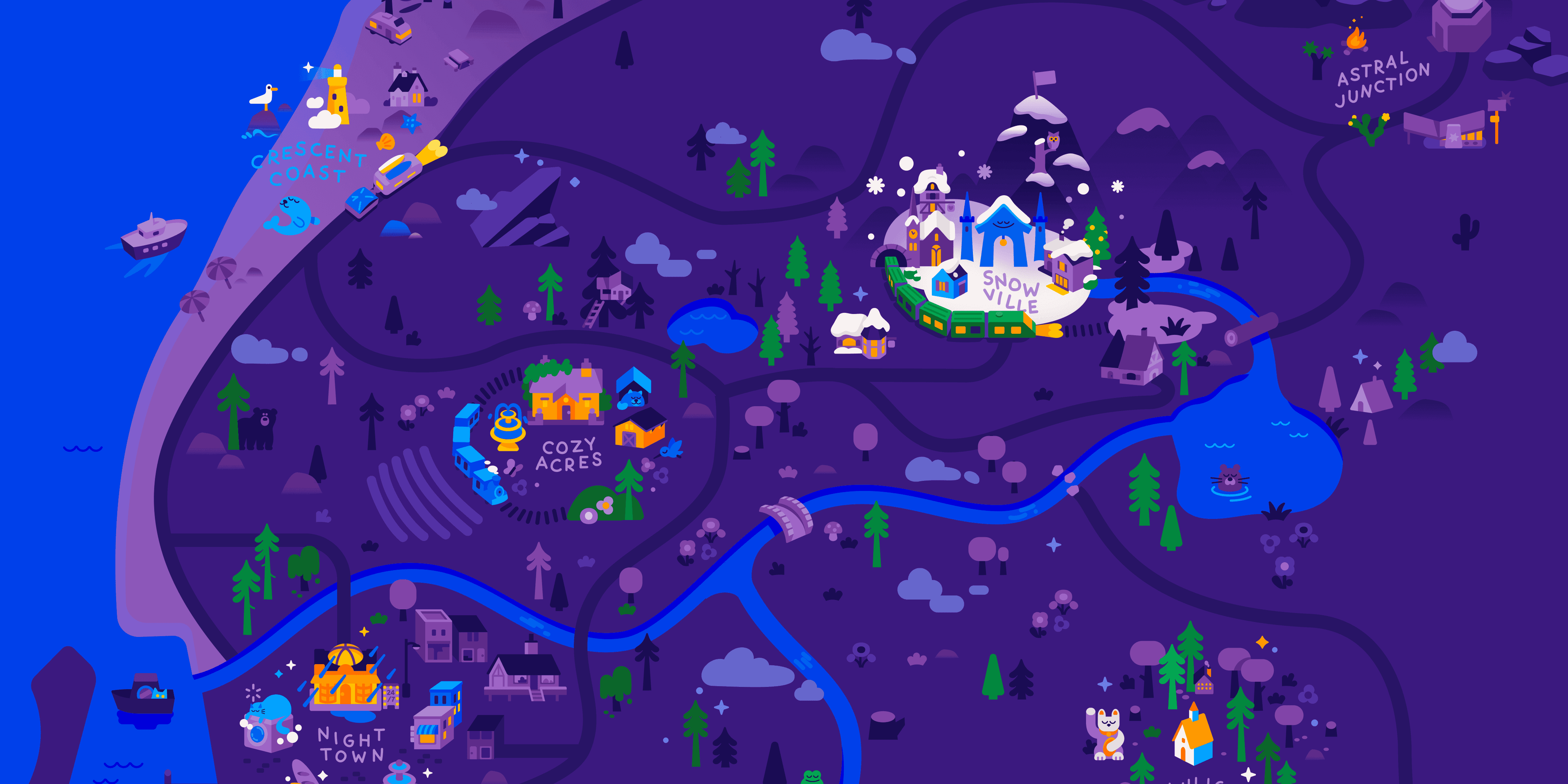 ¹ The Snooziverse refers to a cohesive narrative that interconnects the various characters, themes, and locations in Headspace’s growing library of sleepcasts. I worked with one of our illustrators to augment the map in a way that better lends itself to an interactive setting.